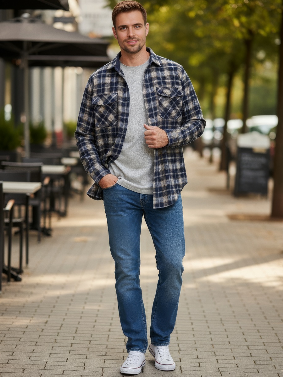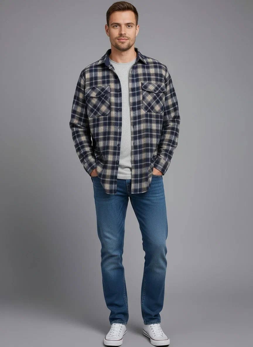 Тёплая фланелевая рубашка - то что нужно и прохладной осенью, и зимой! Фланель – это достаточно плотный, мягкий материал, который обеспечивает тепло и комфорт при ношении. Фланель хорошо сочетается с любыми джинсам или повседневными брюками. Носить лучше расстегнутой, с футболкой, рабочими ботинками. Для офиса такой образ, скорее всего, не подойдет, а вот для выходного дня или поездки на природу – в самый раз.