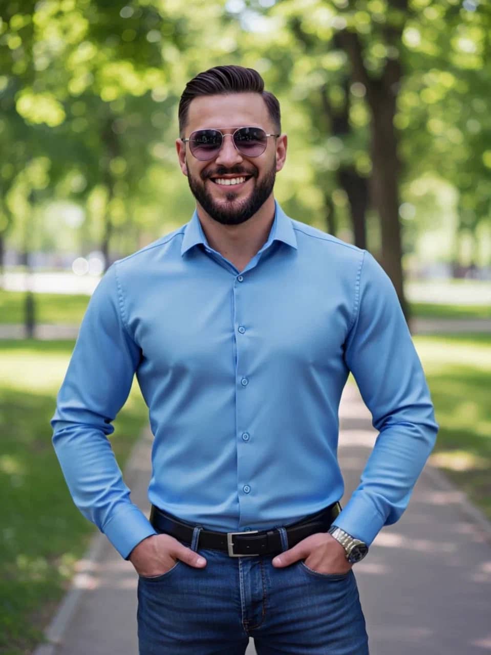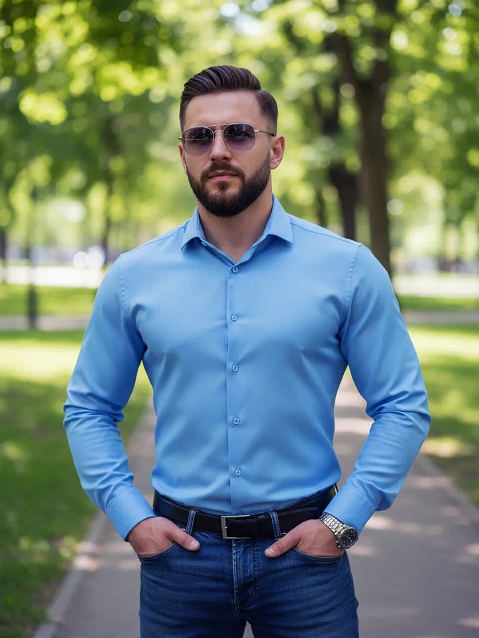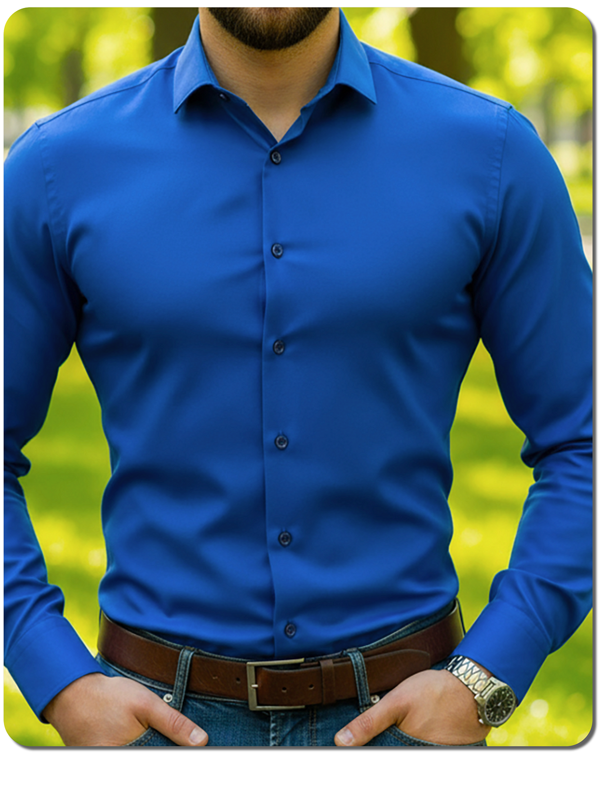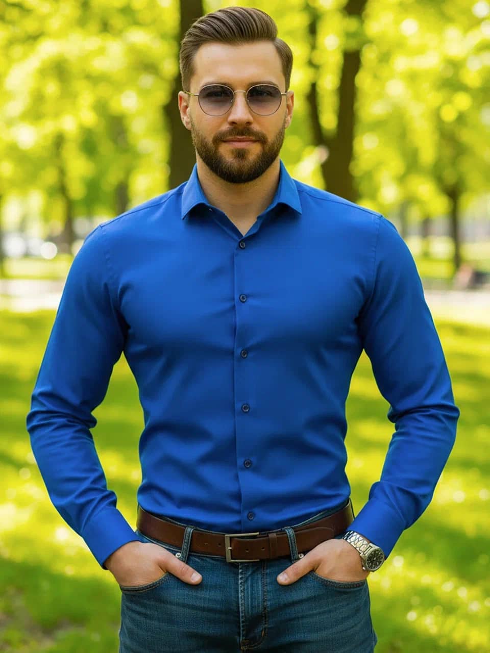 Однотонная синяя рубашка - идеальный базовый элемент гардероба.