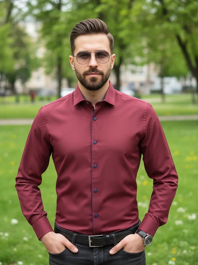 Бордовая рубашка в фактурный рисунок, в виде мелкой диагональной полоски в тон ткани. Удобная застежка на кнопках – надежная фиксация и комфорт в носке. Отделка по краю планки и внутри манжет делает модель не только стильной, но и практичной.