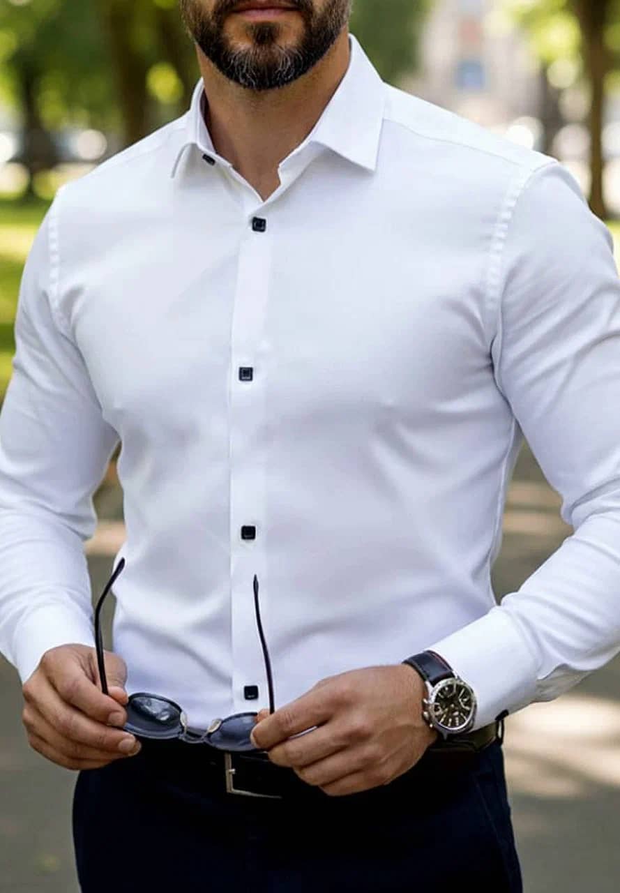 Застёгивается на черные кнопки, контрастирующие с основным цветом рубашки. Без карманов – лаконичный дизайн без лишних деталей. Эластичный материал обеспечивает удобство и свободу движений. Белая рубашка - это необходимая вещь в гардеробе любого мужчины.