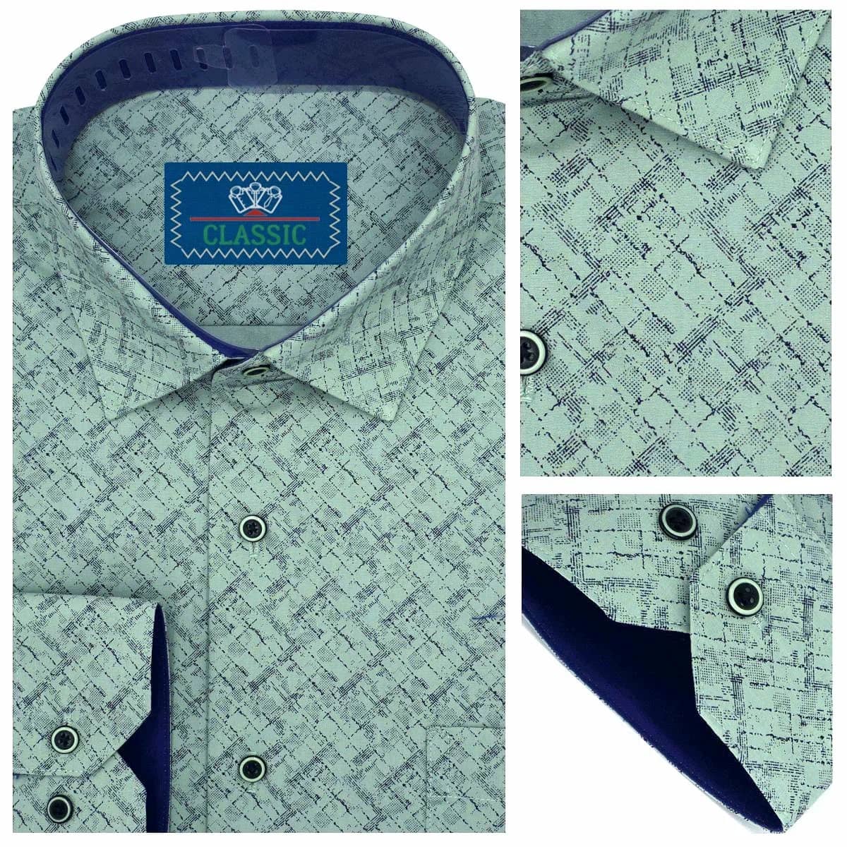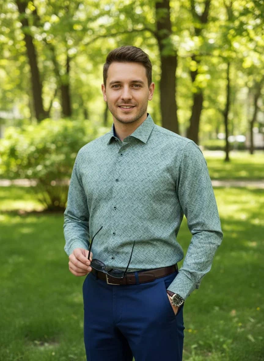 Зеленая рубашка в мелкий рисунок (темно-синий узор на белом фоне) – универсальный базовый цвет для любых образов. Удобная застежка на кнопках – надежная фиксация и комфорт в носке.