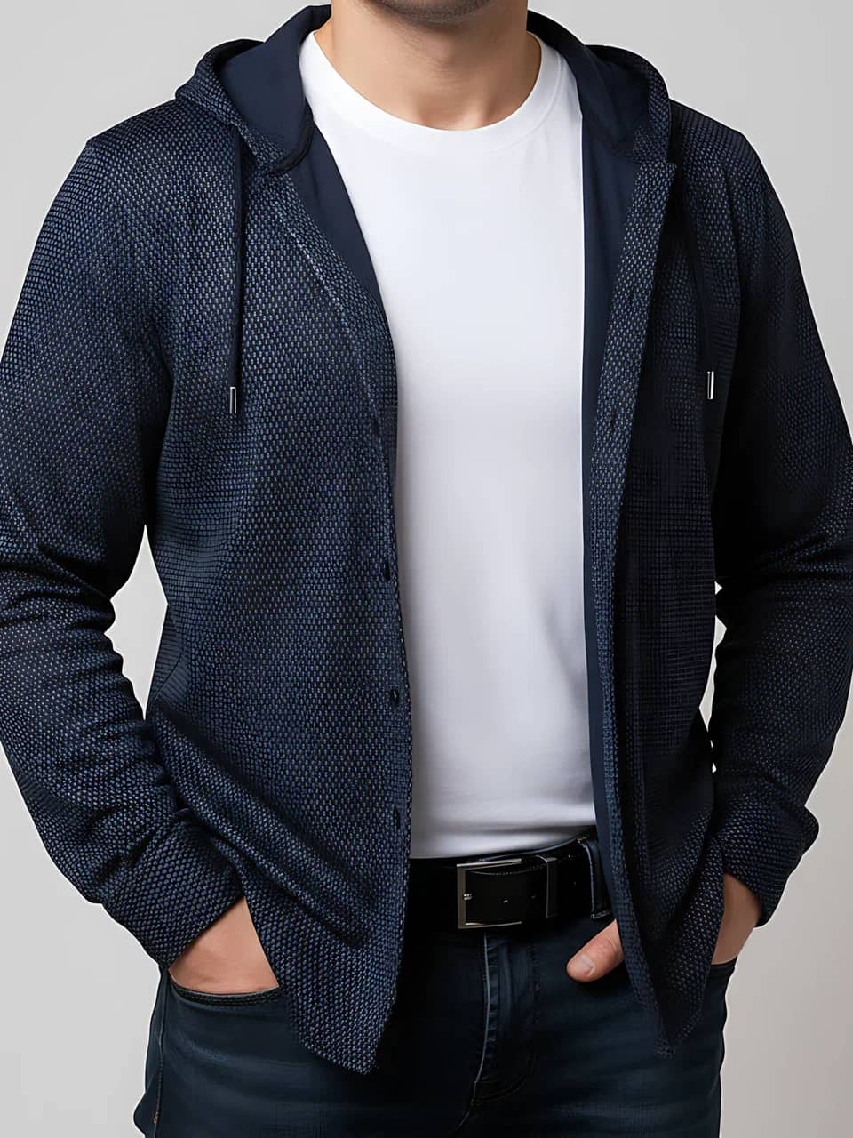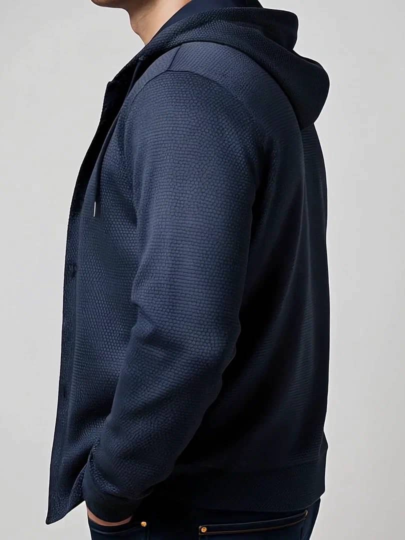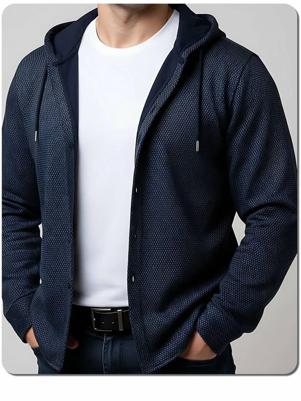 НОВИНКА - утепленная рубашка с капюшоном! Уютная и теплая мужская рубашка на ФЛИСЕ пригодится прохладной осенью Когда речь заходит о комфорте и стиле в холодное время года, утеплённая рубашка с длинным рукавом и капюшоном это настоящая находка! Эта модель не только выглядит модно, но и обеспечивает тепло благодаря флисовому подкладу. Серый принт на темно-синем фоне — сочетание, которое подойдет к чему угодно.